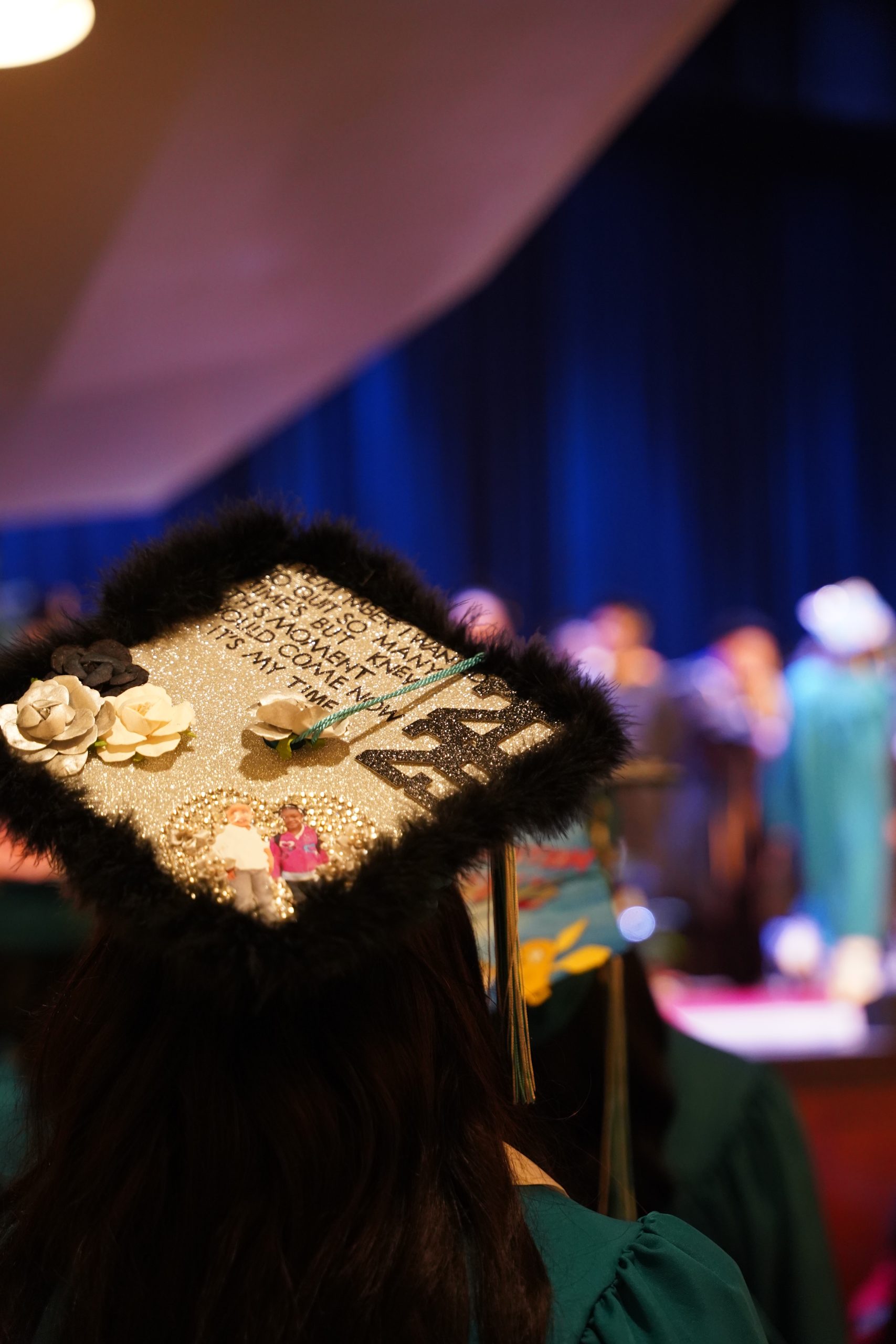 A graduate sits in the audience at Flint Community Schools’ commencement on June 3, 2025, wearing a mortarboard adorned with a personal message reflecting their journey. (Joshua Johnson | Flint Beat)