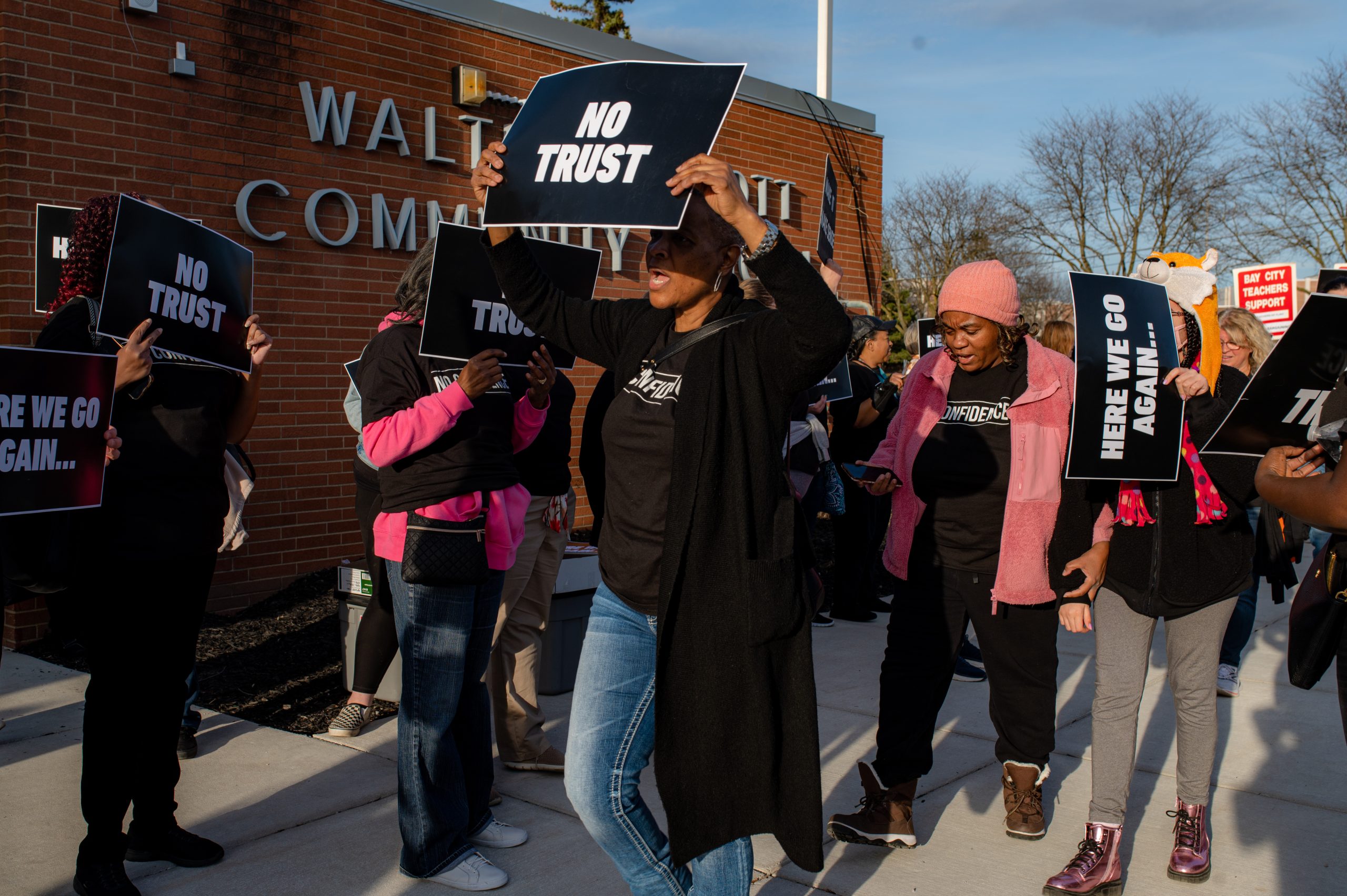Flint Community Schools teachers file into Accelerated Learning Academy to protest for better wages during the Flint Community Schools Board of Education meeting on Wednesday, March 13, 2024. (Michael Indriolo | Flint Beat)