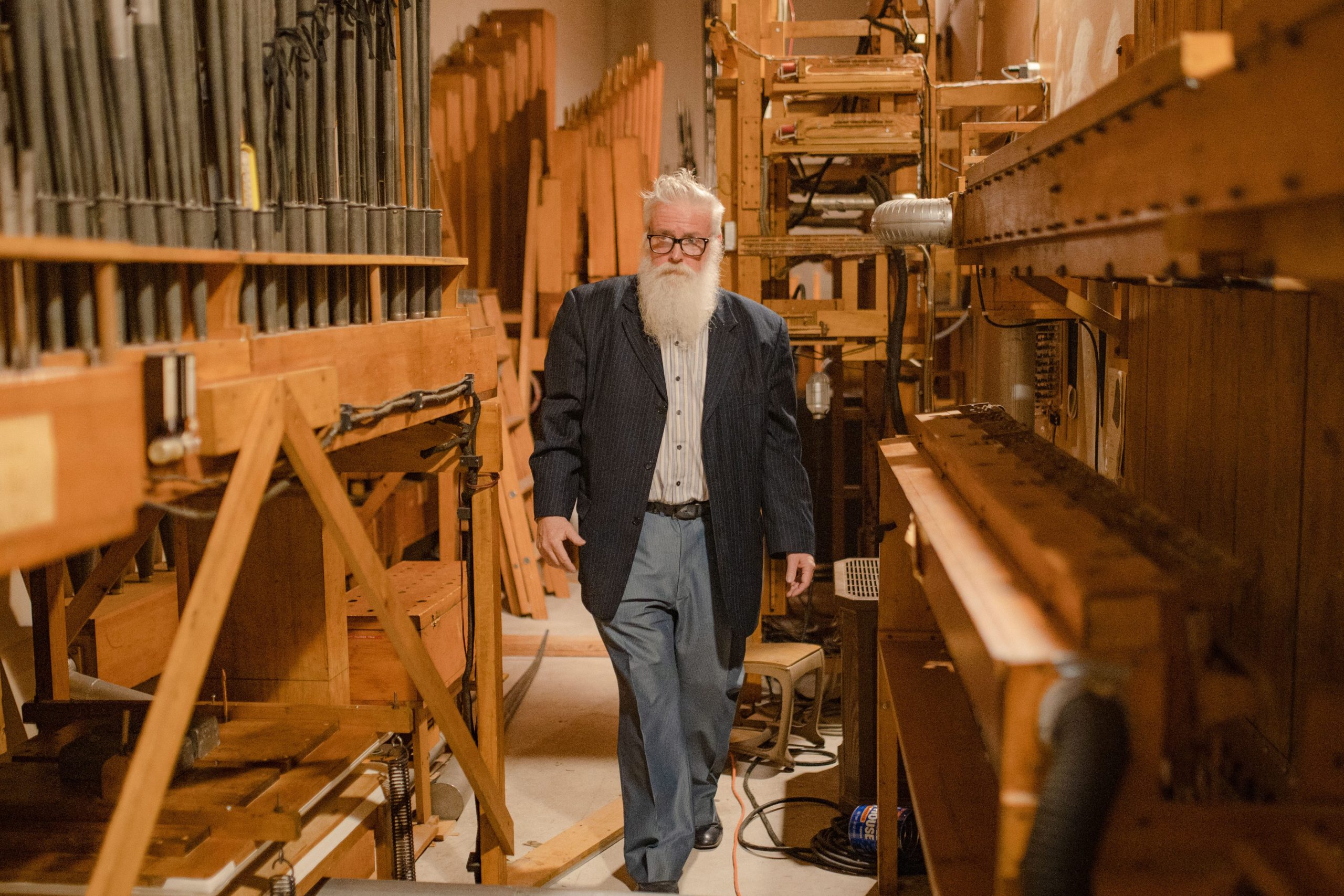 Dr. Quincy Dobbs walks among the dozens of pipes and instruments that together produce the variety of sounds for his theatre organ in an annex above the MacArthur Recital Hall at the Flint Institute of Music on Wednesday, March 15, 2023. (Michael Indriolo | Flint Beat)