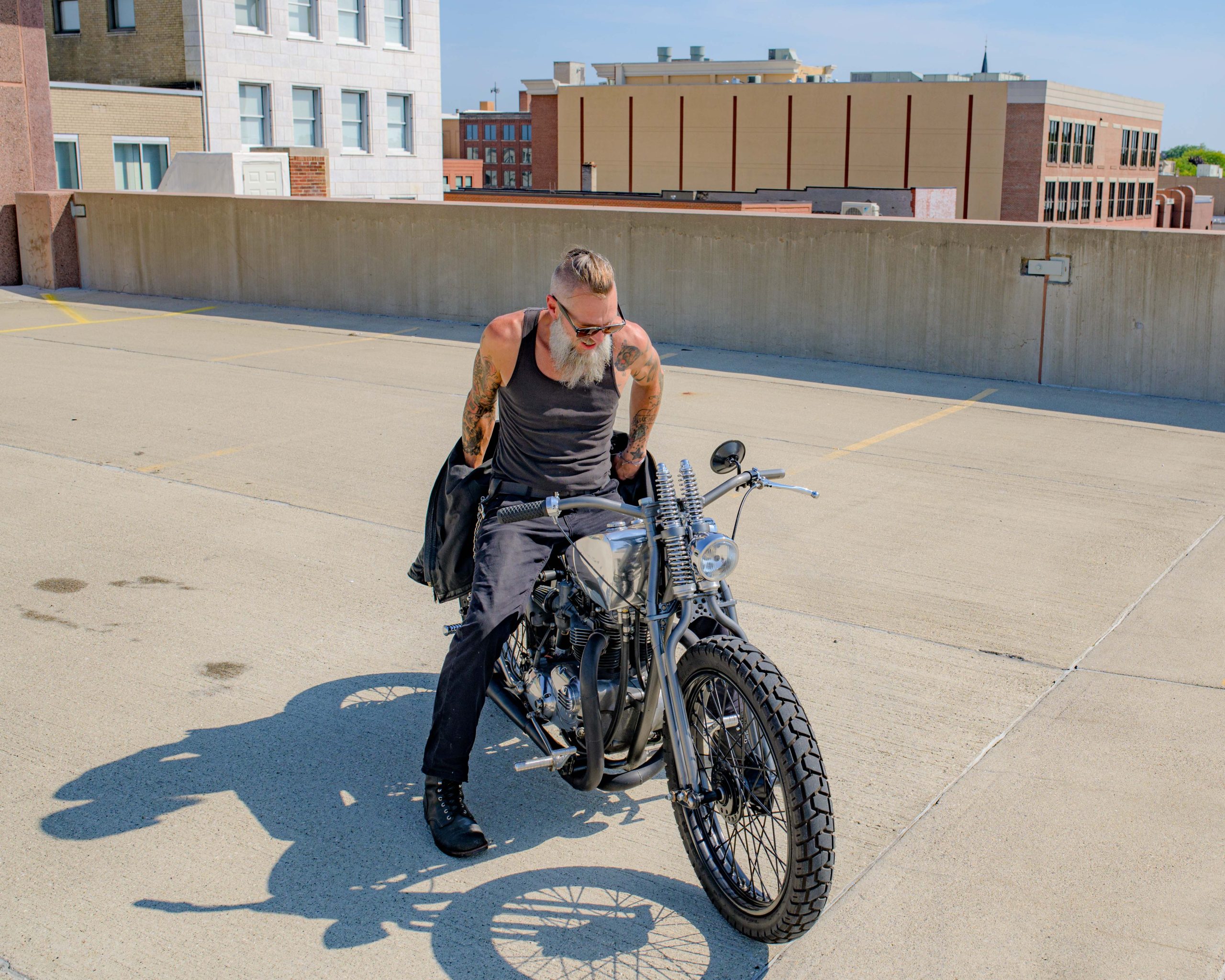 Patrick Knight takes one of his bikes for a spin in downtown Flint, Mich. on Thursday, Sept. 21, 2023. (Michael Indriolo | Flint Beat)