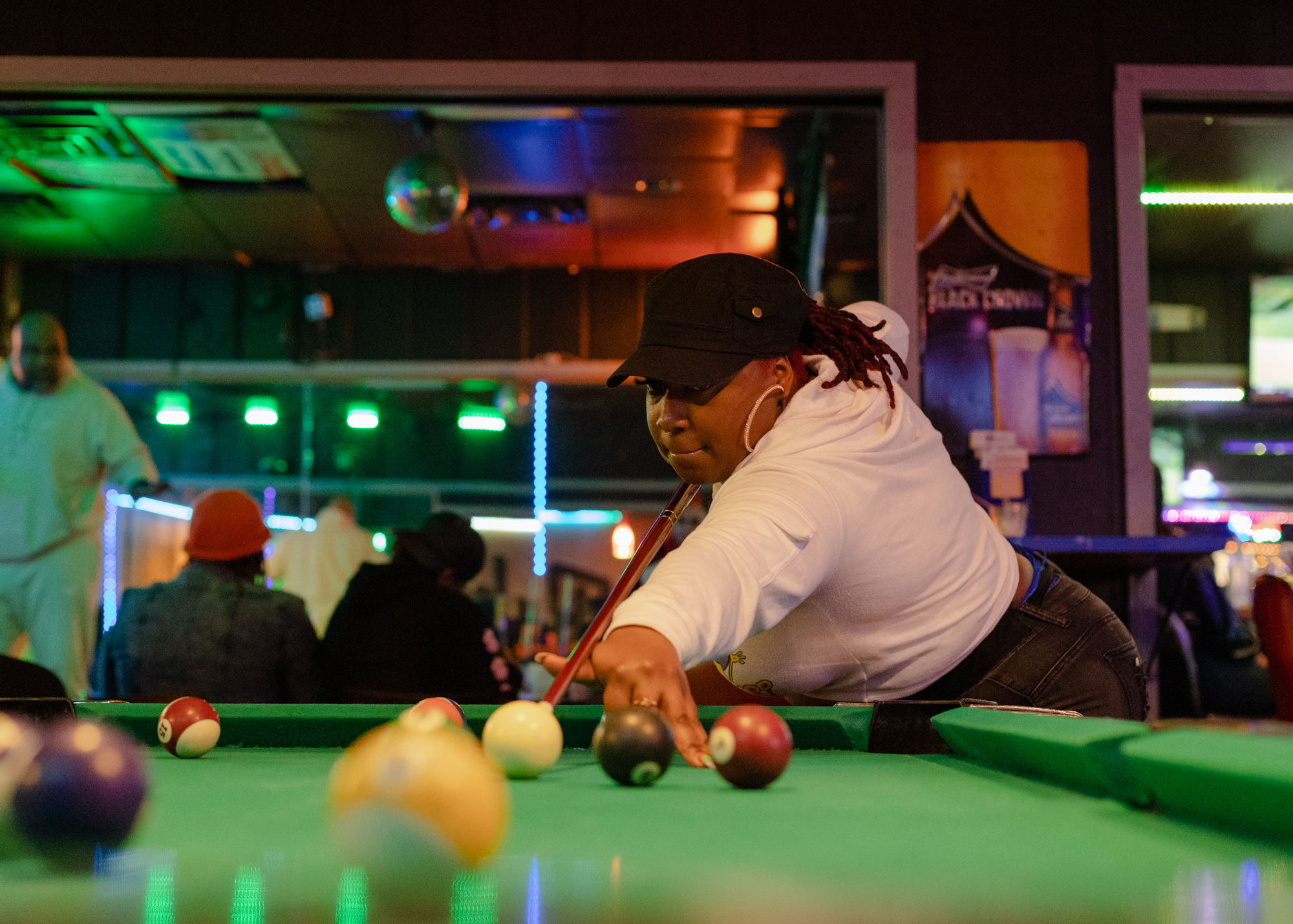 Buffie Johnson, 29, of Flint, lines up a shot during a game of pool at Rubes bar on April 7, 2022. (KT Kanazawich | Flint Beat)
