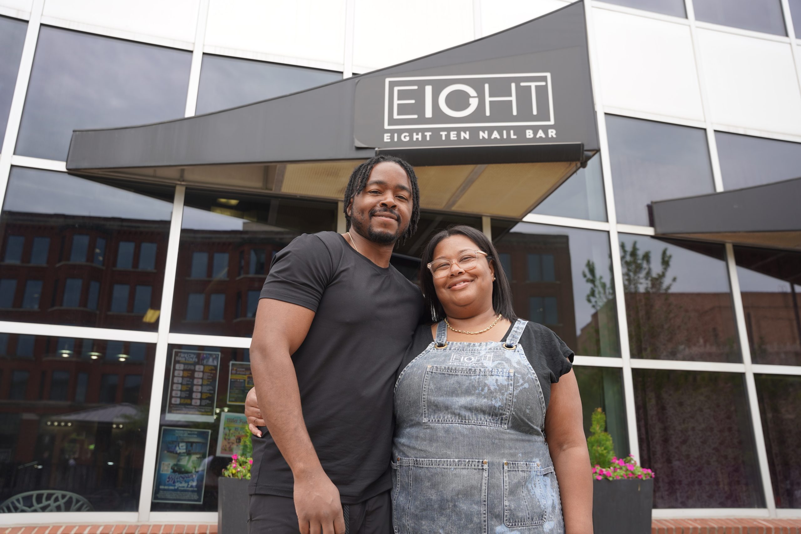 Alex and Natalie Kadie, co-owners of Eight Ten Nail Bar in downtown Flint, stand outside their salon on June 20, 2025. (Joshua Johnson | Flint Beat)