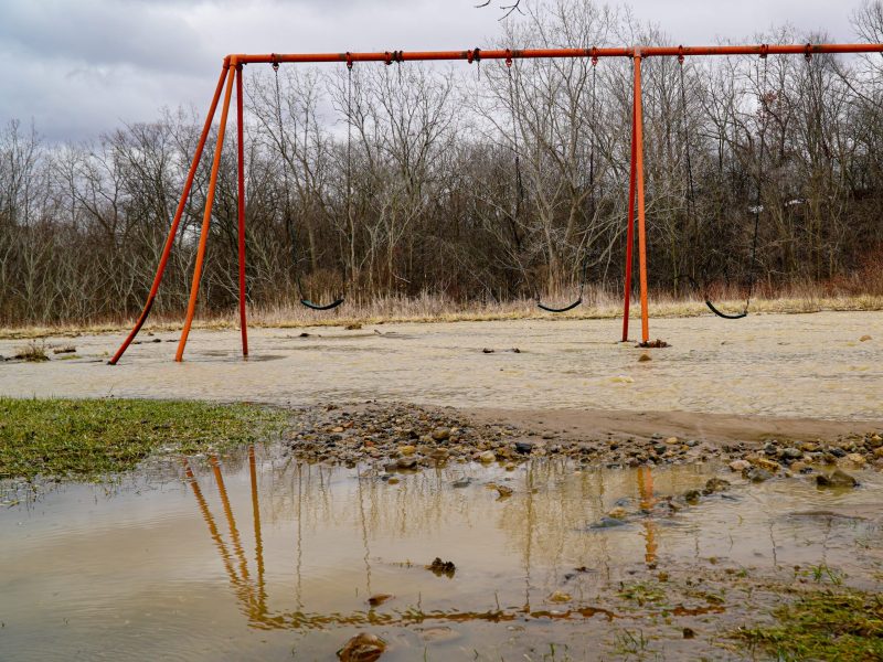 Water flows through a park near the site of a water main break resulting in a citywide boil advisory in Flint, Mich. on Friday, Feb. 9, 2023. (Joshua Johnson