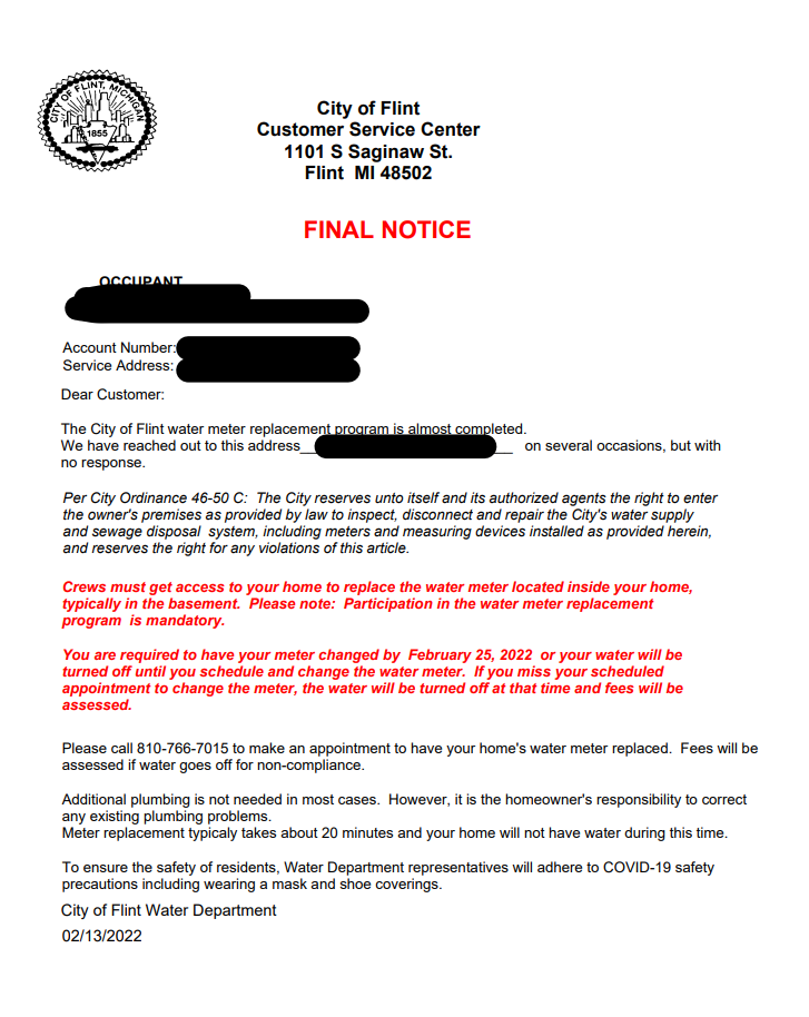 On Feb. 22, Trujillo told Flint Beat in an email that residents are given notice “in accordance with the City Ordinance,” with a minimum of three notices sent to each residence encouraging the residents to contact Customer Service and make arrangements to upgrade their meter.