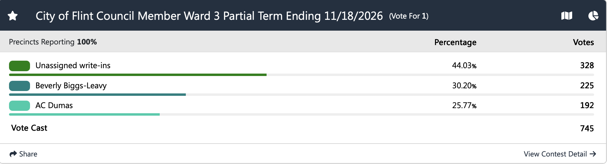 Unassigned write-ins received 328 votes, Beverly Biggs‑Leavy received 225 votes, and A.C Dumas received 192 votes.