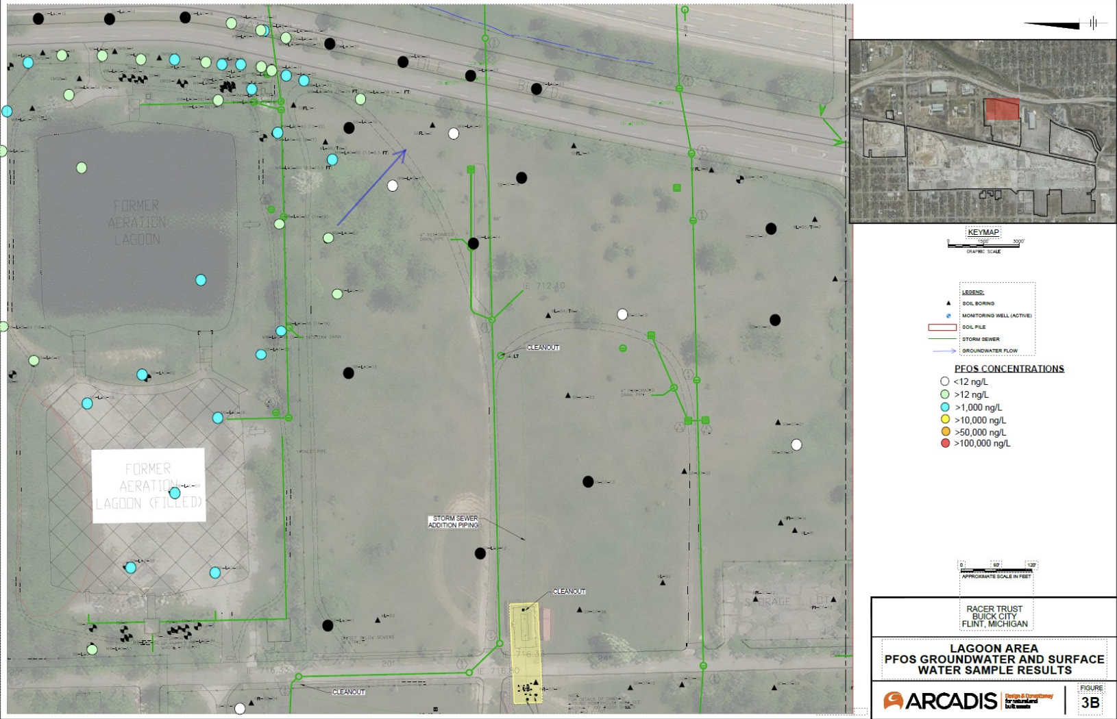 During the environmental update meeting, Trigger shared recent groundwater and surface water data that showed many testing sites at Buick City’s former lagoon area have PFOS (a subcategory of PFAS) concentrations at greater than 1,000 nanograms of substance per liter or ng/L.