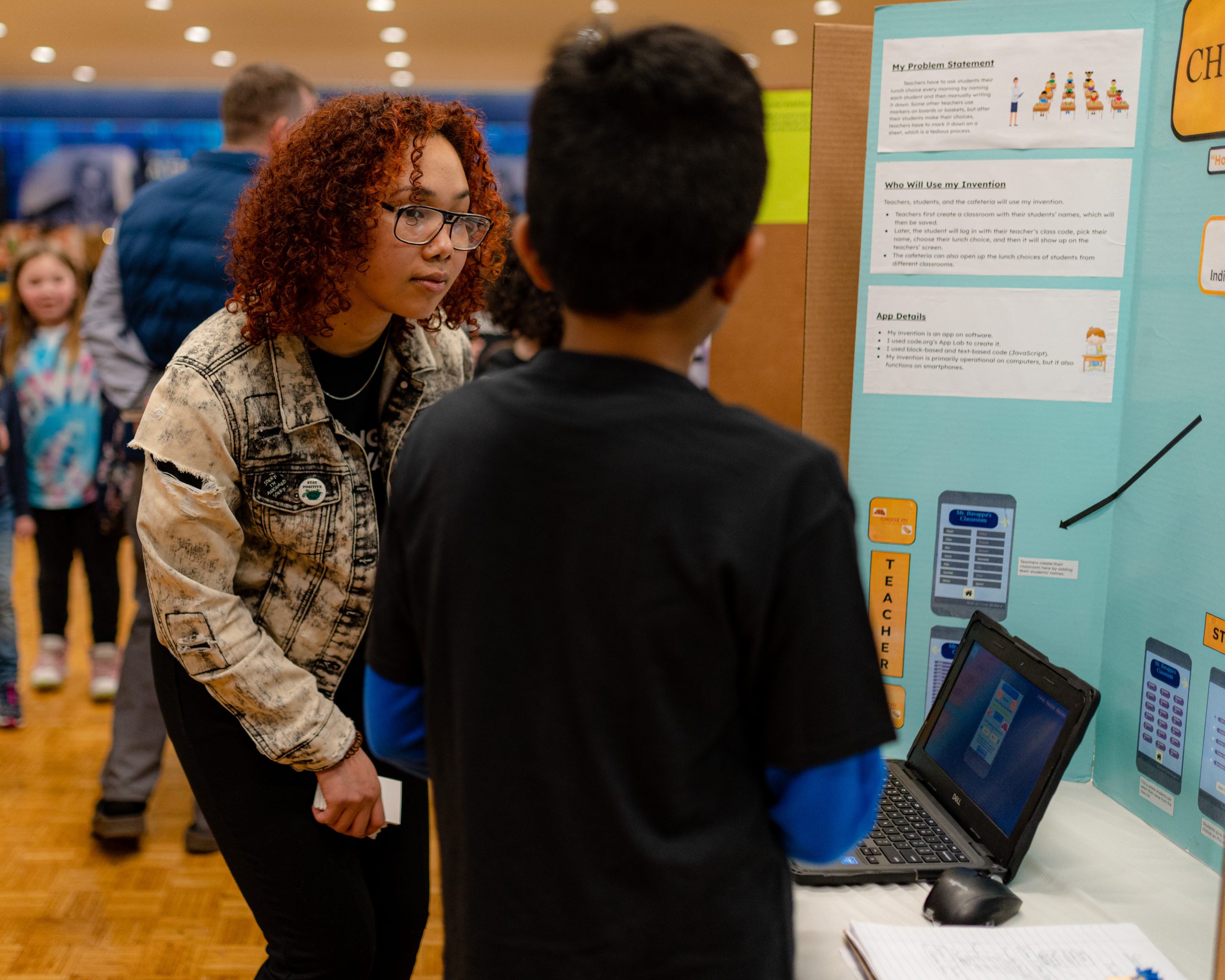 Indian Hill Elementary School student Aniruddh Basappa explains his invention, an app called “CHOOZ IT!” that allows students to select hot or cold school lunches more easily, to Vivian Williams, the Community Engagement Coordinator at 100k Ideas, during the Young Innovators Fair at Kettering University’s Campus Center in Flint, Mich. on Tuesday, March 7, 2023. (Michael Indriolo | Flint Beat)