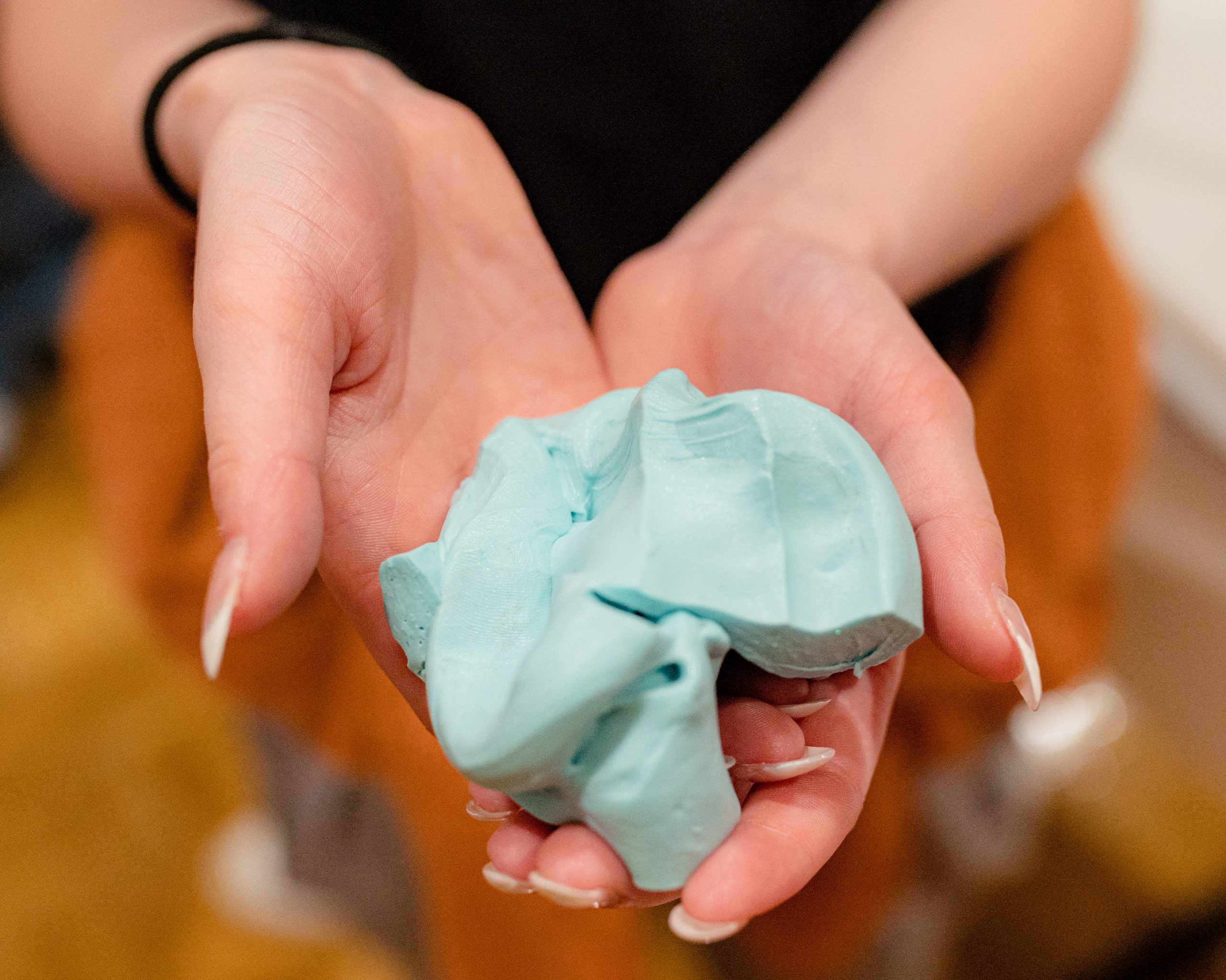 Brendel Elementary School student Heidi Lange shows other students her invention, a scented slimey material called “Sticky Scents” that’s designed to be relaxing and soothing, during the Young Innovators Fair at Kettering University’s Campus Center in Flint, Mich. on Tuesday, March 7, 2023. (Michael Indriolo | Flint Beat)