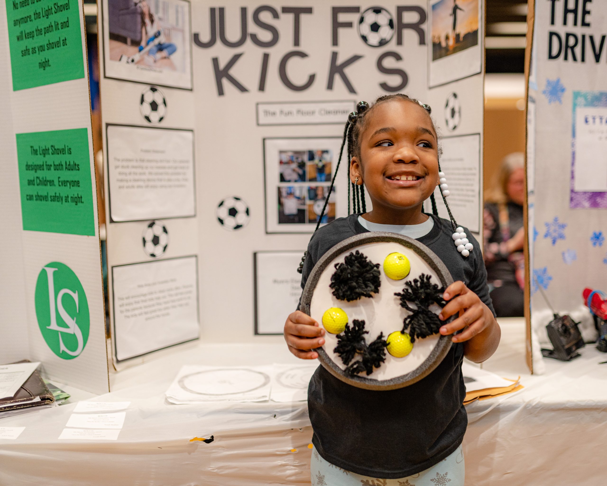 Students from elementery schools around Genesee County, Mich. get ready for a group photo during the Young Innovators Fair at Kettering University’s Campus Center in Flint, Mich. on Tuesday, March 7, 2023. (Michael Indriolo | Flint Beat)Myers Elementary School student Destiny Person holds up “Just for Kicks,” an invention she made with her classmate Gage Phelps that turns sweeping the floor into a fun game, during the Young Innovators Fair at Kettering University’s Campus Center in Flint, Mich. on Tuesday, March 7, 2023. (Michael Indriolo | Flint Beat)