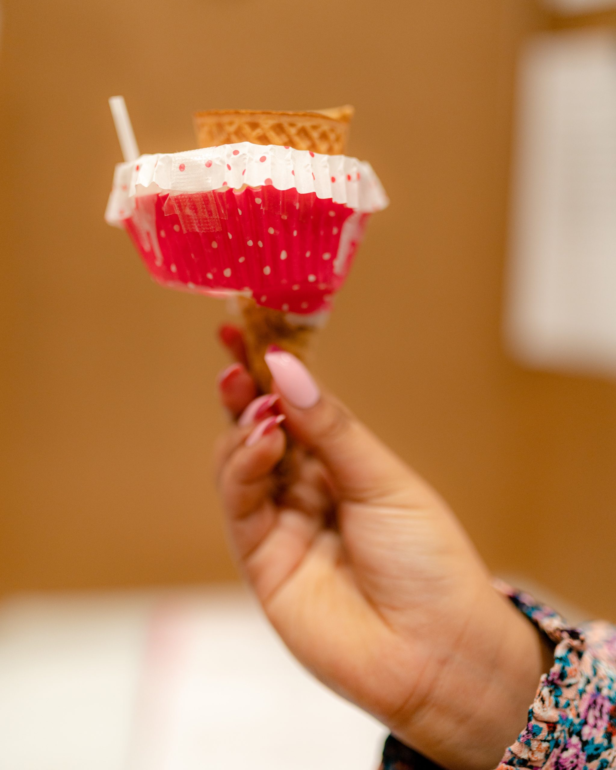 Brendel Elementary School student Rudainaa Samaha holds up an invention she made with her classmate Lexi Ahola, a device that attaches to an ice cream cone and catches any ice cream the melts, during the Young Innovators Fair at Kettering University’s Campus Center in Flint, Mich. on Tuesday, March 7, 2023. (Michael Indriolo | Flint Beat)