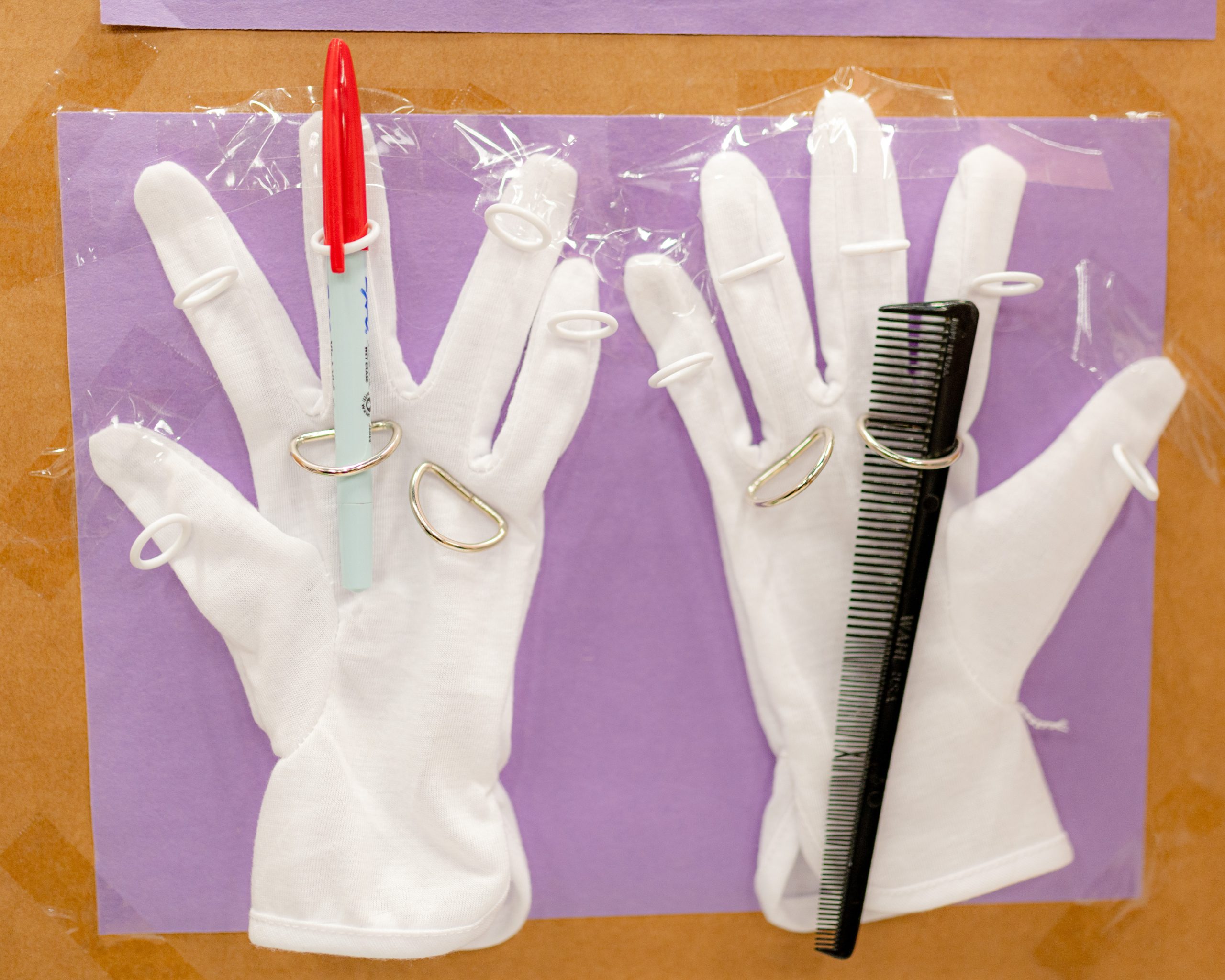 “The Great Gripper Gloves,” an invention made by Indian Hill Elementary School student Arayah Fields, hang on display during the Young Innovators Fair at Kettering University’s Campus Center in Flint, Mich. on Tuesday, March 7, 2023. (Michael Indriolo | Flint Beat)Students from elementery schools around Genesee County, Mich. walk through the Young Innovators Fair at Kettering University’s Campus Center in Flint, Mich. on Tuesday, March 7, 2023. (Michael Indriolo | Flint Beat)