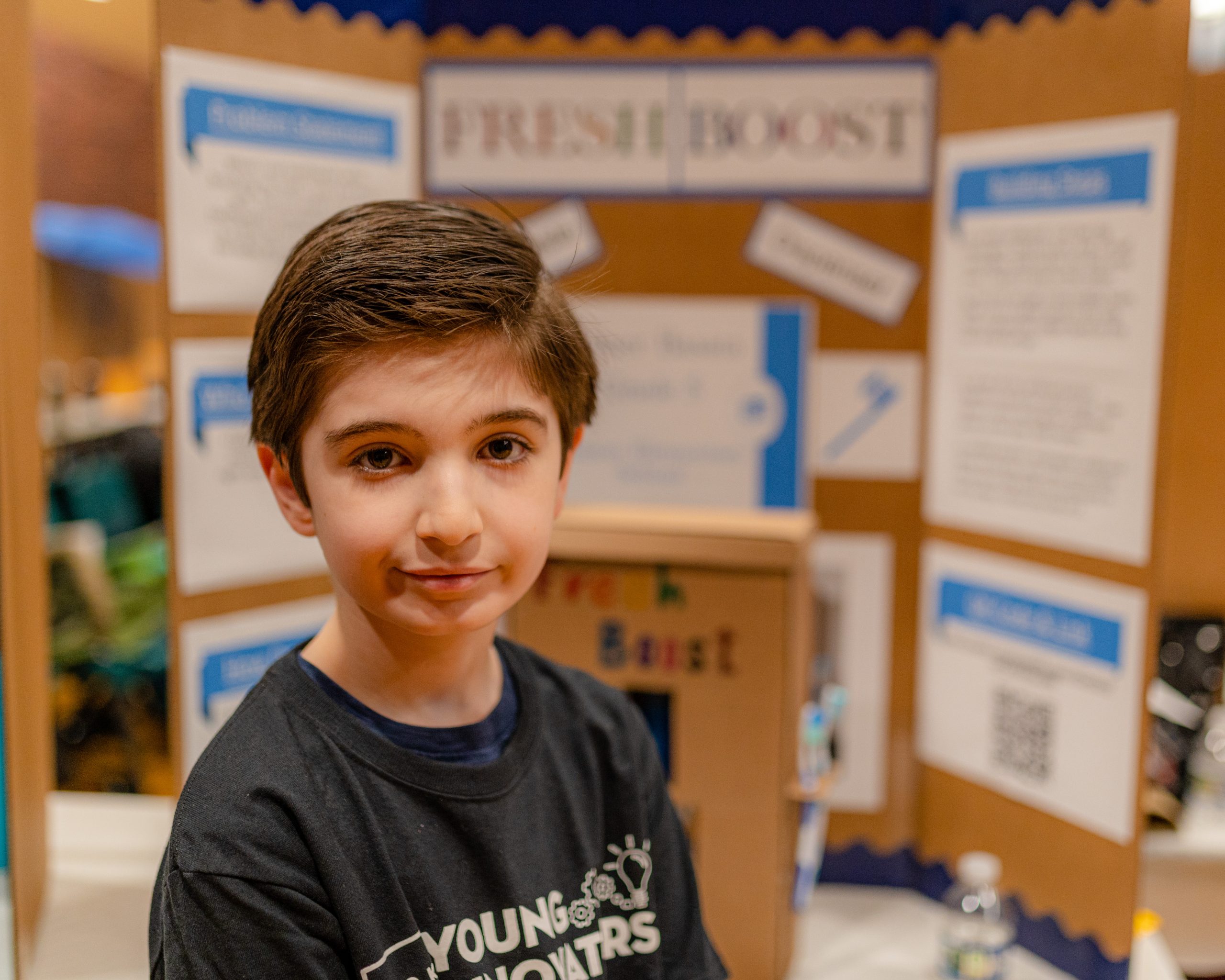 Myers Elementary School student Samer Basata stands in front of his invention, a toothbrush holder and toothpaste dispenser called the “Fresh Boost,” during the Young Innovators Fair at Kettering University’s Campus Center in Flint, Mich. on Tuesday, March 7, 2023. (Michael Indriolo | Flint Beat)