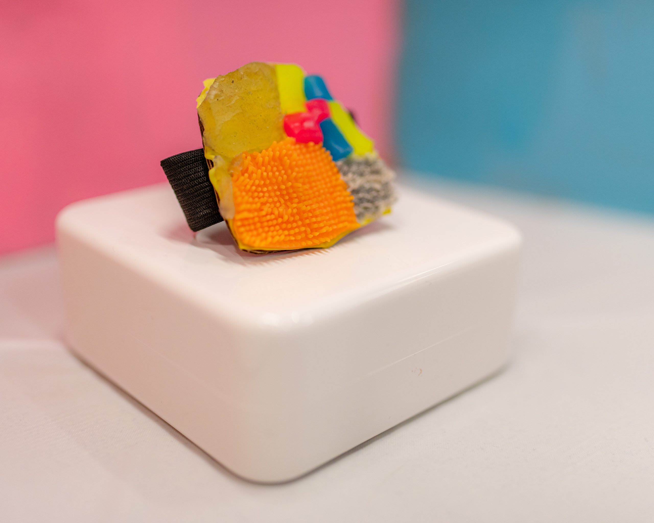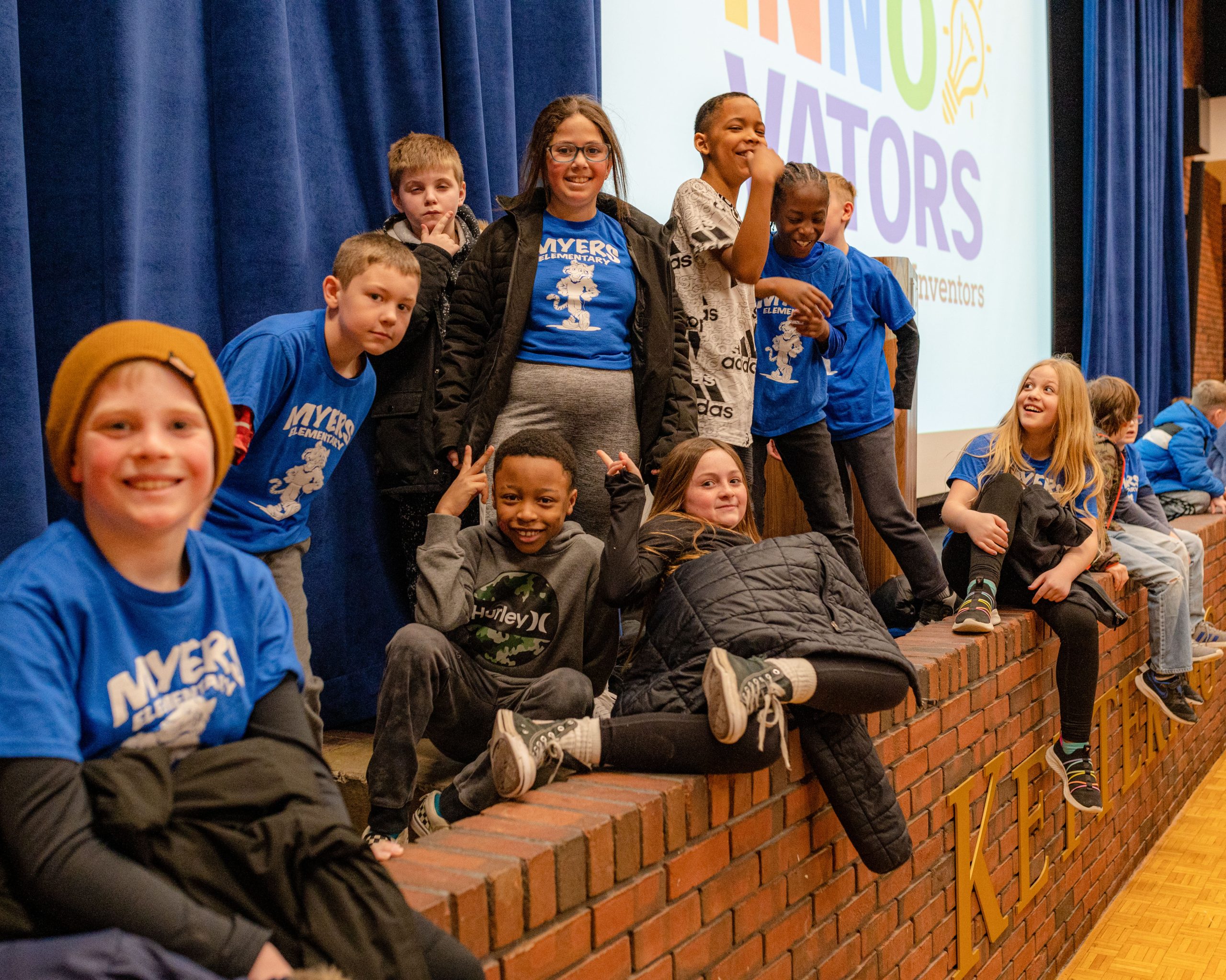 Brendel Elementary School students Hudson Sylvester and Brendon Wilkinson stand in front of their inventions during the Young Innovators Fair at Kettering University’s Campus Center in Flint, Mich. on Tuesday, March 7, 2023. Hudson created a smart watch that reminds students about homework and other school-related activities, and Brendon created a storage box that attaches to walked so people that rely on walkers have a place to store their belongings.(Michael Indriolo | Flint Beat)The Squish and Scratch, a fidgeting toy designed by Indian Hill Elementary School students Molly Steiner and Talia Edwards to help kids with ADHD focus, rests on a display during the Young Innovators Fair at Kettering University’s Campus Center in Flint, Mich. on Tuesday, March 7, 2023. (Michael Indriolo | Flint Beat)Myers Elementary School students strike poses for a photo during the Young Innovators Fair at Kettering University’s Campus Center in Flint, Mich. on Tuesday, March 7, 2023. (Michael Indriolo | Flint Beat)