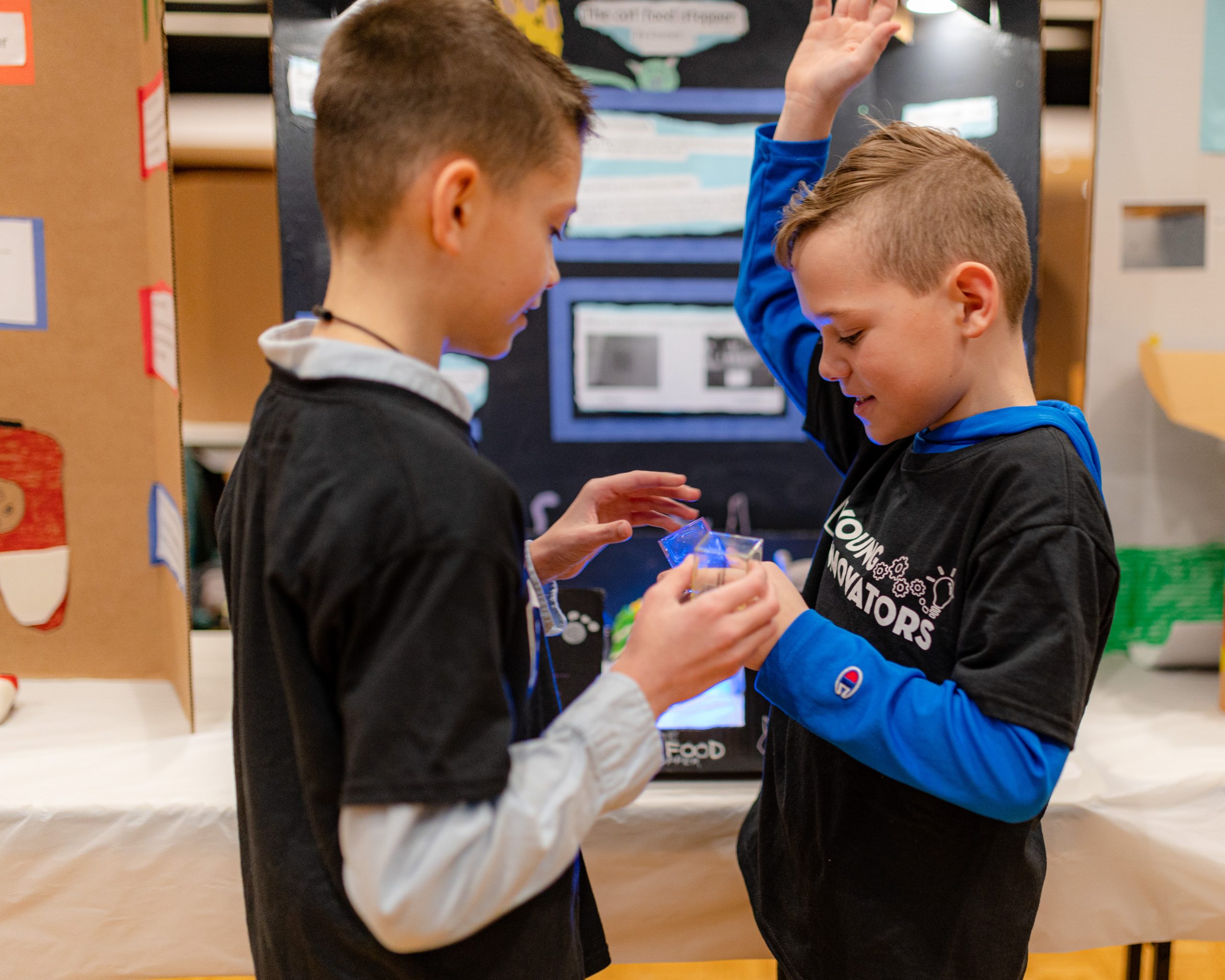 Myers Elementary School students Emmett Shemanski and Wyatt Hunt celebrate as they solve a puzzle toy during the Young Innovators Fair at Kettering University’s Campus Center in Flint, Mich. on Tuesday, March 7, 2023. (Michael Indriolo | Flint Beat)