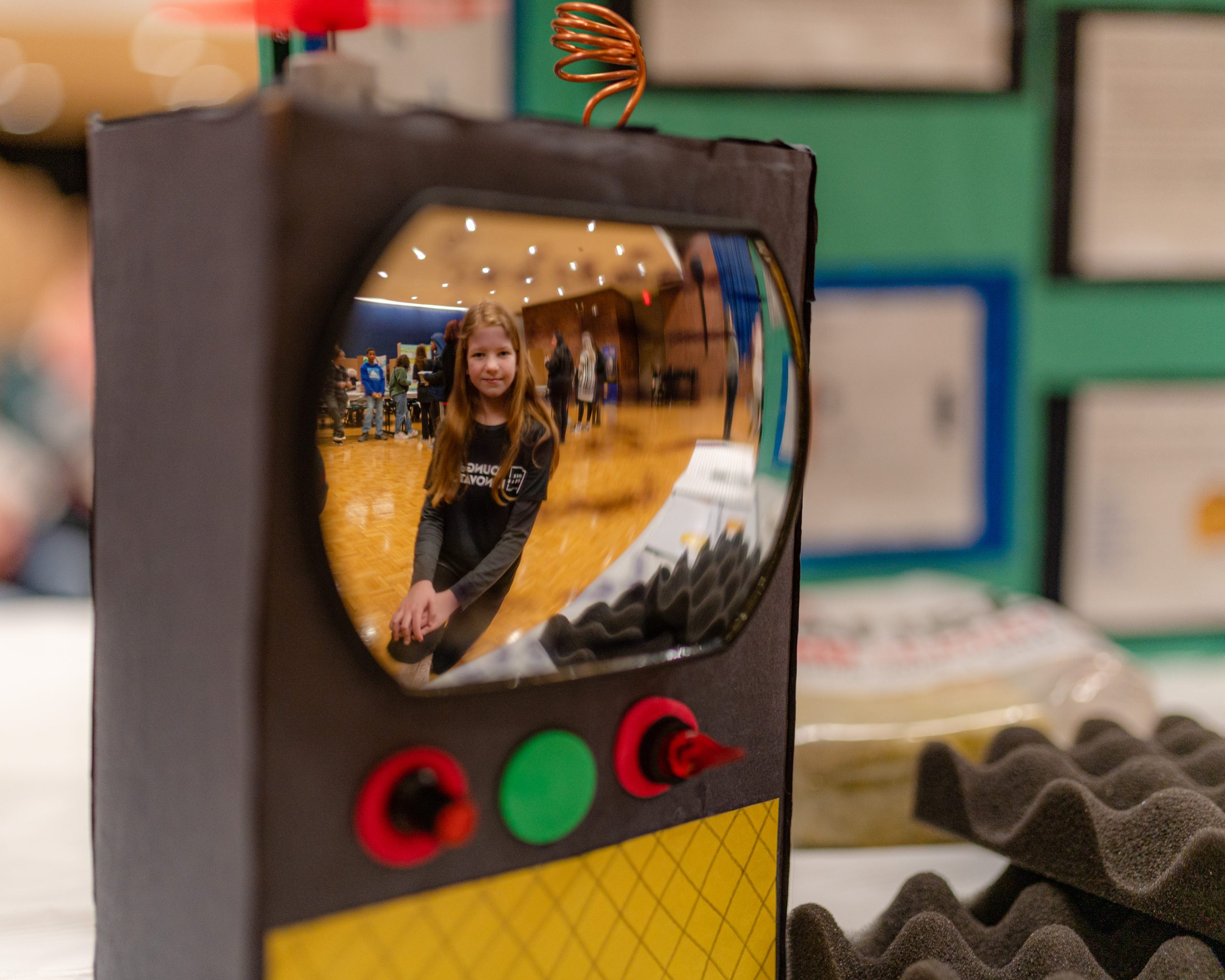 Perry Innovation Center student Sarah Smallidge is reflected in the prototype for her invention, a device that locates the source of echoes and recommends locations for soundproofing materials to reduce them, during the Young Innovators Fair at Kettering University’s Campus Center in Flint, Mich. on Tuesday, March 7, 2023. (Michael Indriolo | Flint Beat)