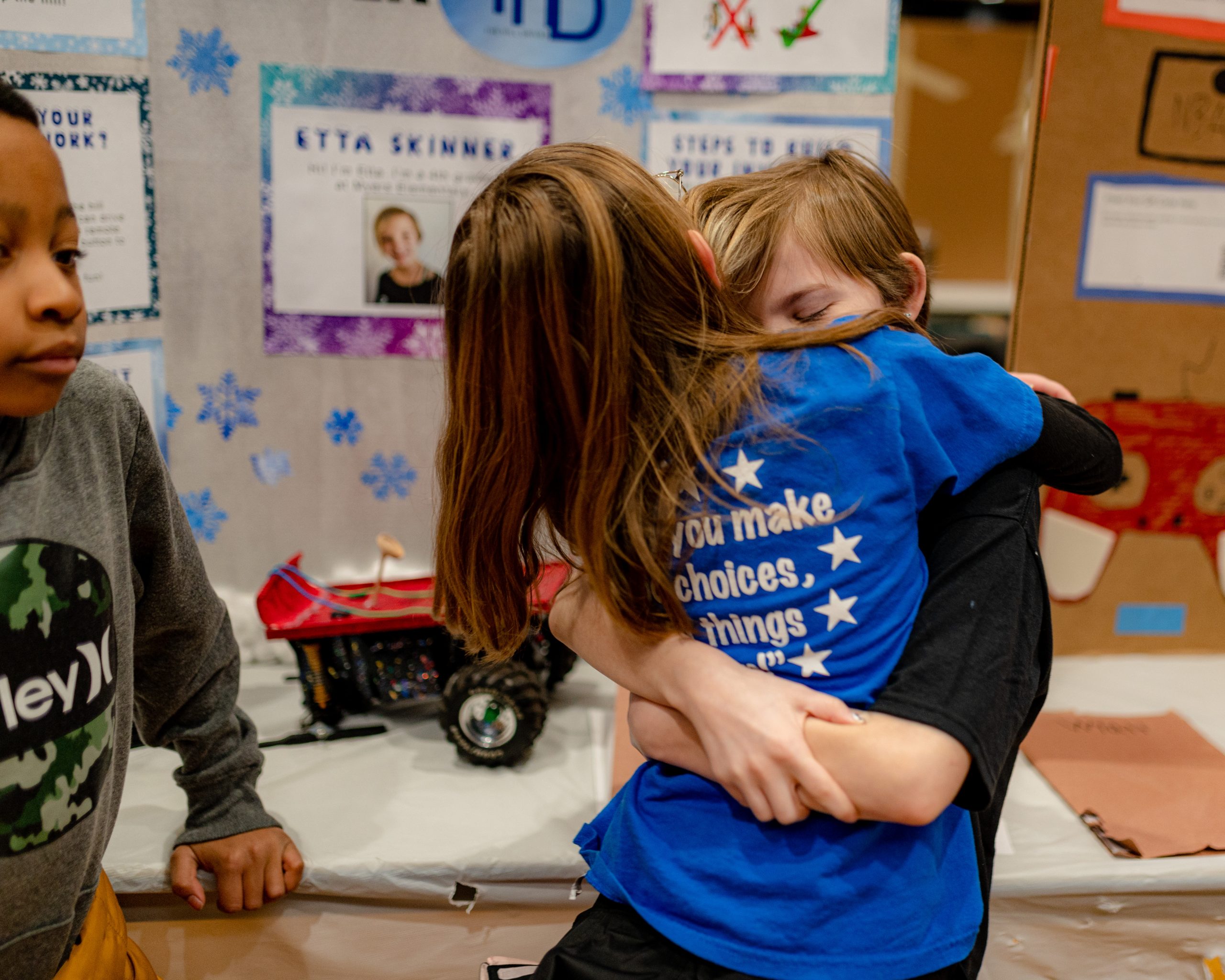 Myers Elementary School student student Madelyn Hunt holds her invention, a remote control door lock called “The Room Protector,” during the Young Innovators Fair at Kettering University’s Campus Center in Flint, Mich. on Tuesday, March 7, 2023. (Michael Indriolo | Flint Beat)Myers Elementary School students Etta Skinner and Addison White hug during the Young Innovators Fair at Kettering University’s Campus Center in Flint, Mich. on Tuesday, March 7, 2023. (Michael Indriolo | Flint Beat)